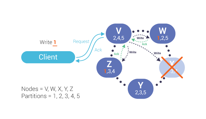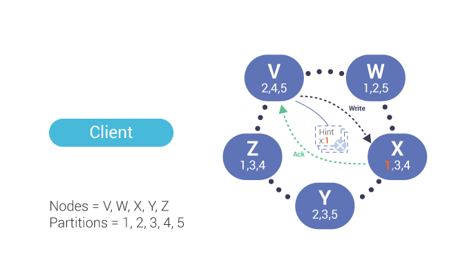 If the consistency level does not require responses from all replicas, the co-ordinator, V in this case, will respond to the client that the write was successful. The co-ordinator will write and store a hint for the missing node: